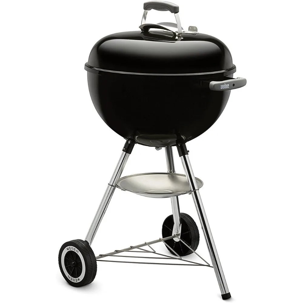 This charcoal grill features a steel cooking grate that is durable and made from premium materials, designed to withstand frequent use. The porcelain-enameled lid and bowl are heat-resistant and designed to retain heat well, while also being resistant to rust and peeling. The grill comes with a One-Touch cleaning system that includes an aluminized steel ash catcher, making ash removal efficient and enhancing the grill's longevity against corrosion. The handles are made with glass-reinforced nylon, ensuring they can handle frequent use and heat exposure. The grill also has a lid hook and a heat-shielded handle for safe and comfortable handling. With all-weather wheels, the grill is portable and can be easily moved around your outdoor space. It is capable of cooking up to thirteen burgers at once using a burger press.