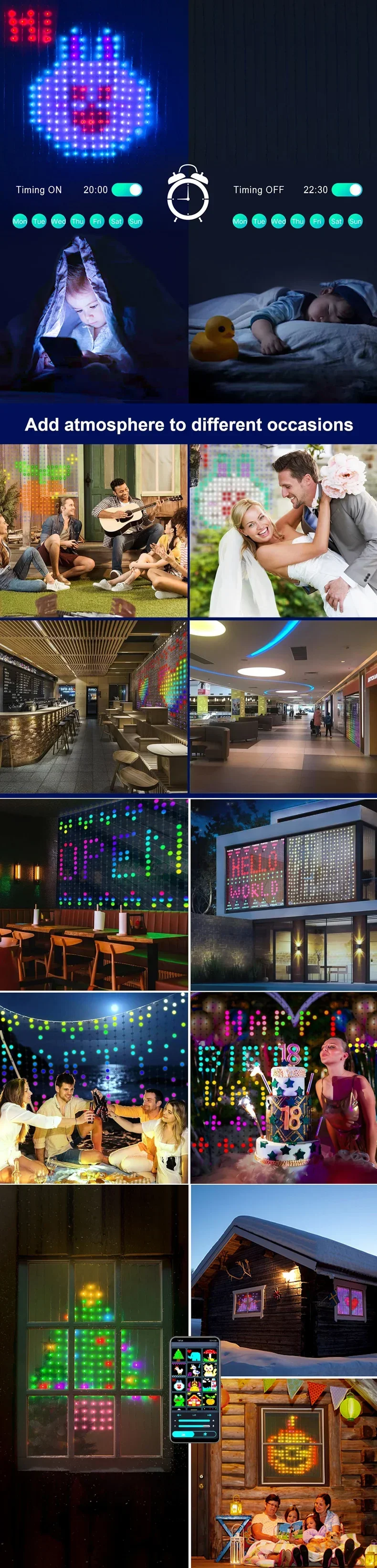 Allowing for higher pixel densities and adding more dimensions to the lighting display. You can use your imagination to draw graphics using different colors, adjust brightness and speed and save them for long term use, this is also an opportunity to show off your own. For example: flag, slogans, cute patterns and etc.(Note: GIF function only applies to a collection, the speed does not support the adjustment)